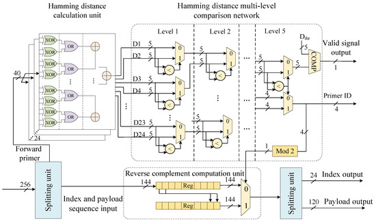 The primer sequence identification module precisely identifies the forward primer sequences at the beginning of each read based on Hamming distance calculations. The primer sequence identification module consists of multiple Hamming distance calculation units, a multi-level comparison network, a reverse complement calculation unit, and a splitting unit (Figure 5). When the 256-bit sequencing reads are output from the FIFO and enter the module, the splitting unit extracts the 40-bit forward primer sequence and the 144-bit index and payload sequence.