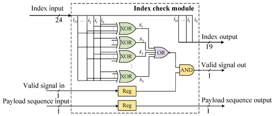 A shortened systematic Hamming code (24, 19) is implemented as the error correction scheme (Figure 6). The received codeword vector is stored in a register, where e represents the error vector. The decoder employs a syndrome-based error detection algorithm, computed as . The syndrome is computed by a parallel logic circuit. When both the computed result and the valid input signal are asserted, the valid output signal is asserted through an AND gate.