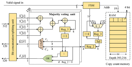 A dedicated hardware circuit module was designed to implement the majority voting process (Figure 7). The module includes majority voting units, copy count memory, FSM, and a bit concatenation/splitting unit, enabling the processing of four sequencing read replicas per clock cycle. The 512-bit input signal, which contains 4 copies, is divided into four groups of 120 single-bit signals by the bit concatenation/splitting unit. The module features 120 majority voting units, enabling the parallel processing of 120 bits of payload. The input signal corresponds to the i-th bit of the l-th sequencing copy from the n-th reference sequence. The number of occurrences of bit ‘1’ in l copies is calculated using a parallel adder tree, and the result is accumulated and stored in Reg_1. Every four cycles of valid input signals constitutes a complete round of majority voting, and Reg_1 is updated to reflect the total count of bit ‘1’ occurrences in all of the copies at that position. The value in Reg_1 is left-shifted by one bit () and compared with the copy count () stored in Reg_2. If exceeds , the output is set to ‘1’; otherwise, it is set to ‘0’.