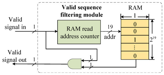 Due to the removal of homopolymer sequences measuring longer than three bases during index design, the data payload stored in the off-chip DRAM exhibits discontinuities. The resulting consensus sequences contain invalid data. To address this, we employ a valid-sequence filtering module to remove invalid data. The hardware structure of this module is shown in Figure 8 and includes a RAM address counter and RAM. The RAM has a depth of and a width of 1 bit. The valid signals of the consensus sequence are counted upwards to generate the RAM read address. If the current data are invalid, the RAM outputs ‘0’; otherwise, the RAM outputs ‘1’. This module occupies only 16 BRAM resources, which is a significant resource saving compared to storing the entire index mapping table.