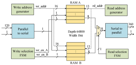 The deinterleaver module restores the original codeword order by applying row–column deinterleaving to the consensus sequence and erasure marker sequence. The module employs a dual RAM partition ping-pong architecture, as shown in Figure 9. It utilizes two RAM units, each with a depth of 64,800 and a width of 1 bit, to construct a 180-row × 360-column interleaved matrix. The workflow of the deinterleaver module is as follows. Taking the 120-bit-wide consensus sequence deinterleaving as an example, the consensus is first converted from parallel to serial and written column-wise to partition A of RAM. Then, after partition A is filled with 64,800 bits, the consensus is written column-wise to partition B of RAM, while partition A reads out the data row-wise with a width of 8 bits. Finally, the codeword data are reassembled by a serial-to-parallel conversion unit into a 360-bit-wide parallel output.
