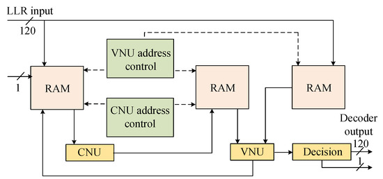 In the accelerator, the LDPC decoder is responsible for correcting the remaining substitution and erasure errors in the codeword [35,36]. The module is based on a partially parallel hierarchical implementation of the normalized min-sum algorithm (NMSA) [37,38,39,40]. The iteration strategy of this algorithm comprises a serial iteration strategy between each group and a parallel iteration strategy within the group, which enables faster convergence of iterative decoding [41,42]. The LDPC decoder module consists of four main components, including the check node unit, the variable node unit, the intermediate variable storage module, and the memory read/write address control module. The intermediate variable storage module contains the log-likelihood ratio (LLR) memory, the check node update RAM, and the variable node update RAM, all of which are implemented using dual-port Block RAM (Figure 10).