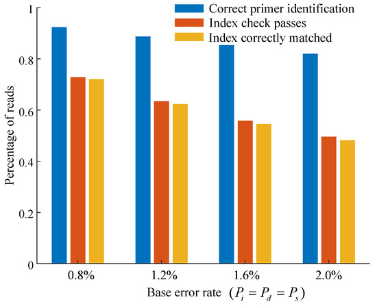 To evaluate the effectiveness of the proposed primer sequence identification and index check method, multiple tests were conducted under varying base error rates. Index sequences were verified using parity check relations (by computing the syndrome), and reads that failed the verification were discarded (Figure 11).