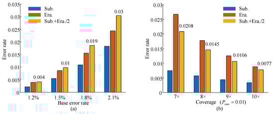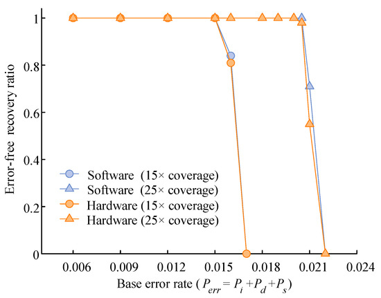 Figure 14 shows the impact of increasing sequencing coverage under a fixed base error rate of 1%. The results indicate that, at this error rate, the proposed heterogeneous platform could achieve error-free data recovery with a minimum coverage of 10×. To further verify the performance of the proposed heterogeneous system in the second-generation high-throughput sequencing scenario, we generated simulation data according to the Illumina sequencing error rate reported by Organick et al. [10]. The results demonstrate that, under this realistic error model, the proposed system can still achieve error-free recovery with a minimum coverage of 8×. This indicates its effectiveness in handling typical errors in second-generation high-throughput DNA sequencing. Moreover, the readout reliability provided by the hardware-accelerated design is comparable to that of the software implementation.