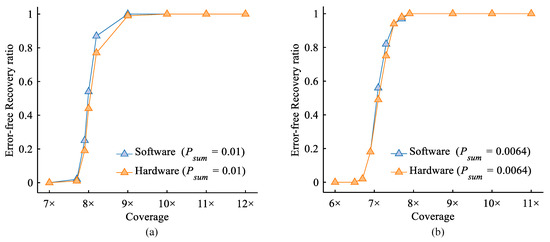 A comparison of the error-free recovery ratios between hardware and software implementations under varying sequencing coverages. (a) The results under an error model with a total base error rate of (). (b) The results under the Illumina sequencing error profile reported by Organick et al. [10] (, , ).