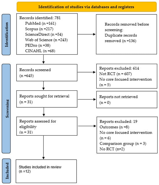 A total of 781 records were identified. After removing duplicates using EndNote bibliographic management software (n = 136), 645 titles and abstracts were screened, and 614 were excluded for not meeting the inclusion criteria. Then, the full text of 31 articles was reviewed, and 12 articles met all the eligibility criteria and were included in the final analysis. Two reviewers (J.D.R.-M. and M.R.-M.) independently conducted the search and study selection. Disagreements were resolved by consulting a third reviewer (I.C.-M.).