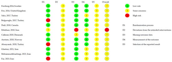 The Revised Cochrane risk of bias tool (RoB-2) was used to assess the risk of bias in the randomized controlled trials included. This tool evaluates five domains: bias arising from the randomization process, due to deviations from the intended interventions, to missing outcome data, in the measurement of the outcome, and the selection of the reported result. Each domain was rated as “high risk of bias”, “low risk of bias,” or “some concerns” [19]. Two reviewers (J.D.R.-M. and M.R.-M.) assessed the methodological quality and risk of bias independently, and in case of disagreement, a third reviewer was consulted (I.C.-M).