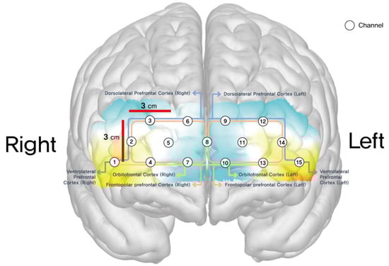 The final output of each optode was then reported as mean total oxygenated hemoglobin (HbO μMol). A total of 15 channels were located on both sides of the dorsolateral prefrontal cortex (DLPFC) (channels 2, 3, 12, 14), orbitofrontal cortex (OFC) (channels 1, 4, 7, 10, 13, 15), and frontopolar prefrontal cortex (FPPFL) (channels 5, 6, 8, 9, 11) [13]. Positions of these channels were: channel 1, right lateral OFC; channels 4 and 7, right medial OFC; channels 2 and 3, right DLPFC; channel 15, left lateral OFC; channels 10 and 13, left medial OFC; channels 12 and 14, left DLPFC; channels 5, 6, 8, 9, and 11, frontopolar prefrontal cortex. Figure 1 shows the positions of these channels.