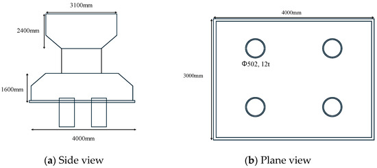 Figure 1. The foundation consists of a 2 × 2 configuration of steel pipe piles, with a pile cap measuring approximately 4 m in width, 3 m in length, and 1.6 m in height. The piles are steel pipe piles with a diameter(Φ) of 502 mm, thickness(t) of 12 mm.