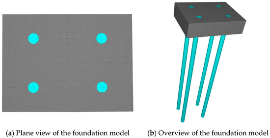 Table 2. The pile foundation was simulated as steel pipe piles (Φ502, 12t). However, for computational convenience, they were modeled as solid circular piles. To maintain equivalent flexural rigidity to the actual steel pipe piles, the diameter was adjusted to Φ329. The pile length was set to 11 m according to the design drawings, ensuring an embedment depth of 2 m into the weathered rock layer. The pile cap was modeled as a reinforced concrete structure with dimensions of approximately 4 m in width, 3 m in length, and 1.6 m in height.