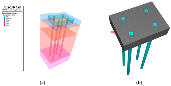 Figure 3, and consisted of five key interaction zones: (1) the lateral interface between the pile cap and the uppermost soil layer, (2) the interface between the pile cap base and the second soil layer, (3) the interface between the piles and the second and third soil layers, and (4) the interface between the piles and the weathered rock. Each interface area is marked with a different color in