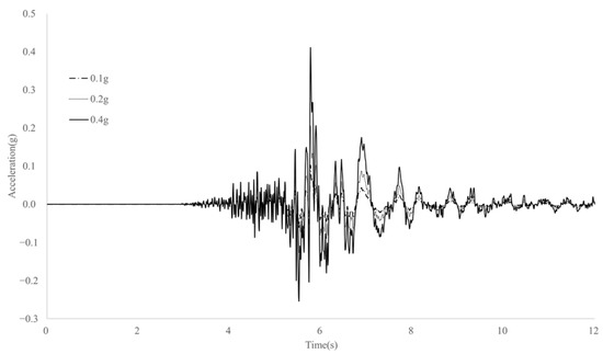Table 4. The input seismic waves were modified to match the design response spectrum from the north-south (NS) component recorded at the PHA2 station (bedrock motion) during the 2017 Pohang earthquake, accounting for the seismic characteristics of the Korean Peninsula. The NS component corresponds to the larger value of the two seismic waves (NS, EW) measured at the PHS station. Seismic accelerations of 0.1 g, 0.2 g, and 0.4 g were used as input motions and applied at the base of the numerical model. The acceleration-time histories of these input motions are illustrated in