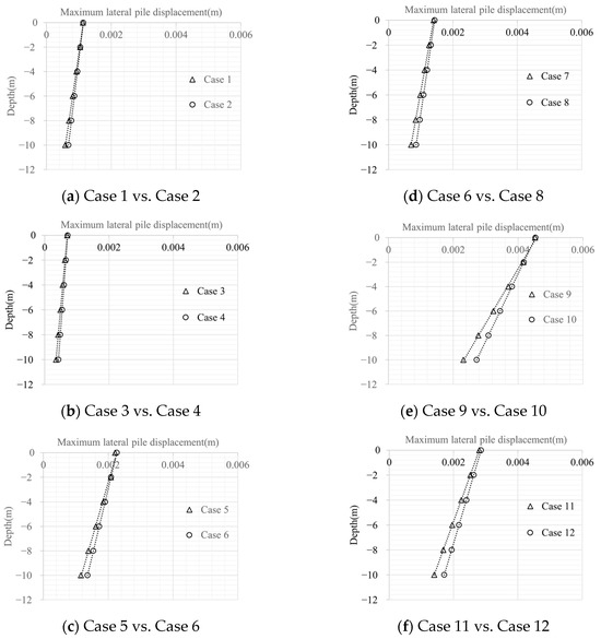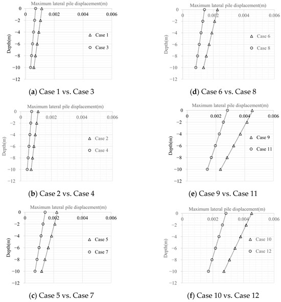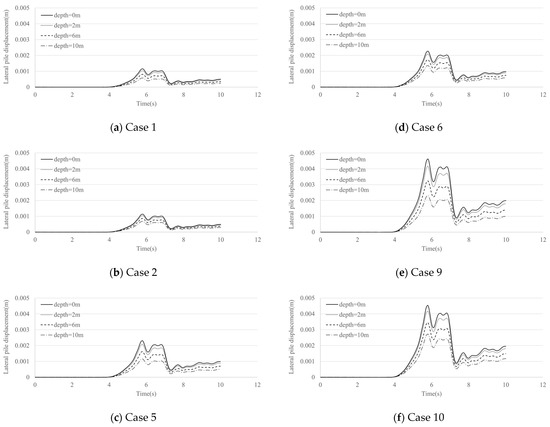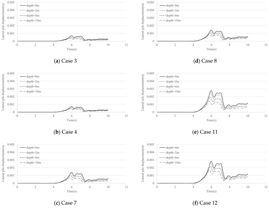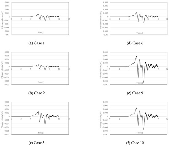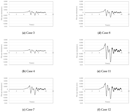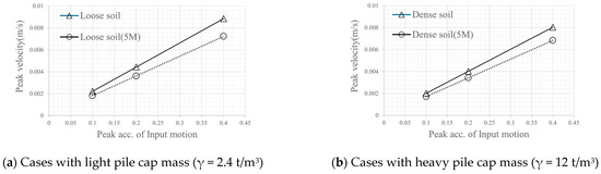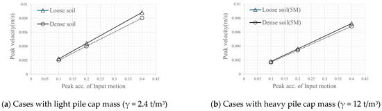 Figure 6. Additionally, to assess the influence of inertial and kinematic interactions in the soil–pile system, two different superstructure mass conditions and two relative soil density conditions were considered. As a result, a total of 12 three-dimensional numerical simulations were conducted. In addition, since velocity and displacement responses are mainly used when evaluating or designing seismic responses of superstructures such as bridges, following analysis results were investigated with a focus on dynamic velocity responses and displacement responses.