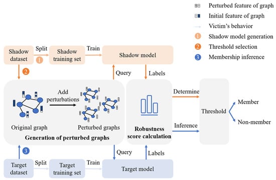 where denotes the robustness score of a given target graph , the target graph corresponds to the ground-truth label y, is the label of predicted by the target model , is a set of perturbed graphs of , and is one of the perturbed graphs. represents the number of elements in . The function is the indicator function: if , it is recorded as 1; otherwise, it is 0. Graphs with relatively high robustness scores are considered members.