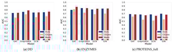where represents the embedding of node at the lth layer, denotes the set of neighbors of node , aggregates information from node and its neighbors, and applies a nonlinear transformation to the aggregated information. The differences among GNN models primarily lie in the implementation strategies of these two functions. We select four GNNs, including Graph Convolutional Network (GCN) [], Graph Attention Network (GAT) [], SAmple and aggreGatE (GraphSAGE) [], and Graph Isomorphism Network (GIN) [].