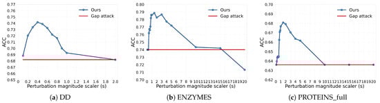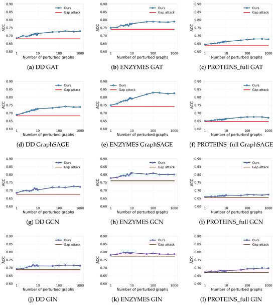 We compare GLO-MIA with the gap attack, and the results are shown in Table 2. In Table 2, we record the “train–test gap”, which represents the gap between the training and testing classification accuracy to measure the overfitting of the target model. The best attack performance for each dataset is highlighted in bold. The experimental results show that GLO-MIA is effective on different GNN models and datasets. For example, on GraphSAGE trained on the DD dataset, it is possible to achieve an attack accuracy of 0.738, which is 5.6% higher than that of the gap attack. On the ENZYMES dataset, the highest attack accuracy can reach 0.825, which is 8.5% higher than that of the gap attack. Furthermore, our experimental results show that the attack performance on the GIN models is lower than that on other GNN models in most cases. For example, the attack accuracy achieved on GIN trained on the DD dataset is 0.713, surpassing that of the gap attack by only 2.5%, which is lower than those of other models on the DD dataset, even though it performs more overfitted (train–test gap = 0.376). This phenomenon is also observed on the ENZYMES dataset. These observations may suggest that GIN may have higher inherent robustness against GLO-MIA. In contrast, GraphSAGE is relatively more vulnerable to GLO-MIA, which is likely due to its aggregation mechanism being more sensitive to feature perturbations in graphs.