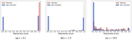 Robustness score distributions of members and non-members under different perturbation magnitude scaler sizes (s: scaler size; red: members; blue: non-members).