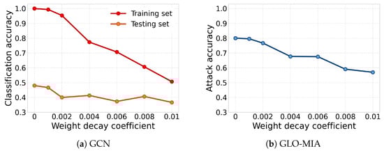 Similar to other MIAs [,,,,], GLO-MIA exploits the model’s overfitting. Regularization techniques such as weight decay are used to reduce overfitting. As a representative case, multiple GCN models are trained on the ENZYMES dataset using different weight decay coefficients. The GLO-MIA is evaluated on these GCN models. The results are shown in Figure 6, where the x-axis represents the weight decay coefficient. In Figure 6a, the y-axis denotes classification accuracy, while in Figure 6b, it represents attack accuracy. As the regularization technique is strengthened, the train–test accuracy gap generally shows a downward trend, indicating that the prediction difference between the training set and the testing set decreases, and the attack accuracy of the GLO-MIA shows a significant decrease. However, we observe that excessive regularization degrades the model’s performance. Therefore, balancing model effectiveness and defense against attacks is critical.