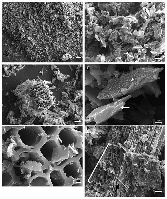 Morphological analysis of VB biochar by SEM. (A,D): Low magnification showed that the biochar appeared to be composed of small fragments. Only a few fragments retained the structure of plant tissues. (B,C) Higher magnification showed that some fragments presented elements belonging to the xylem, such as fibers or vessels. (E) Fragments of biochar showed both smooth and rough surfaces (E, arrow and arrowhead, respectively). (F) Occasionally, large fragments derived from secondary xylem were observed showing vessels with pits, fibers, or pit rays (F; arrow, arrowhead, and bracket, respectively). Magnification bars: (A) 200 µm; (B,F) 20 µm; (E,C) 2 µm; (D): 10 µm.
