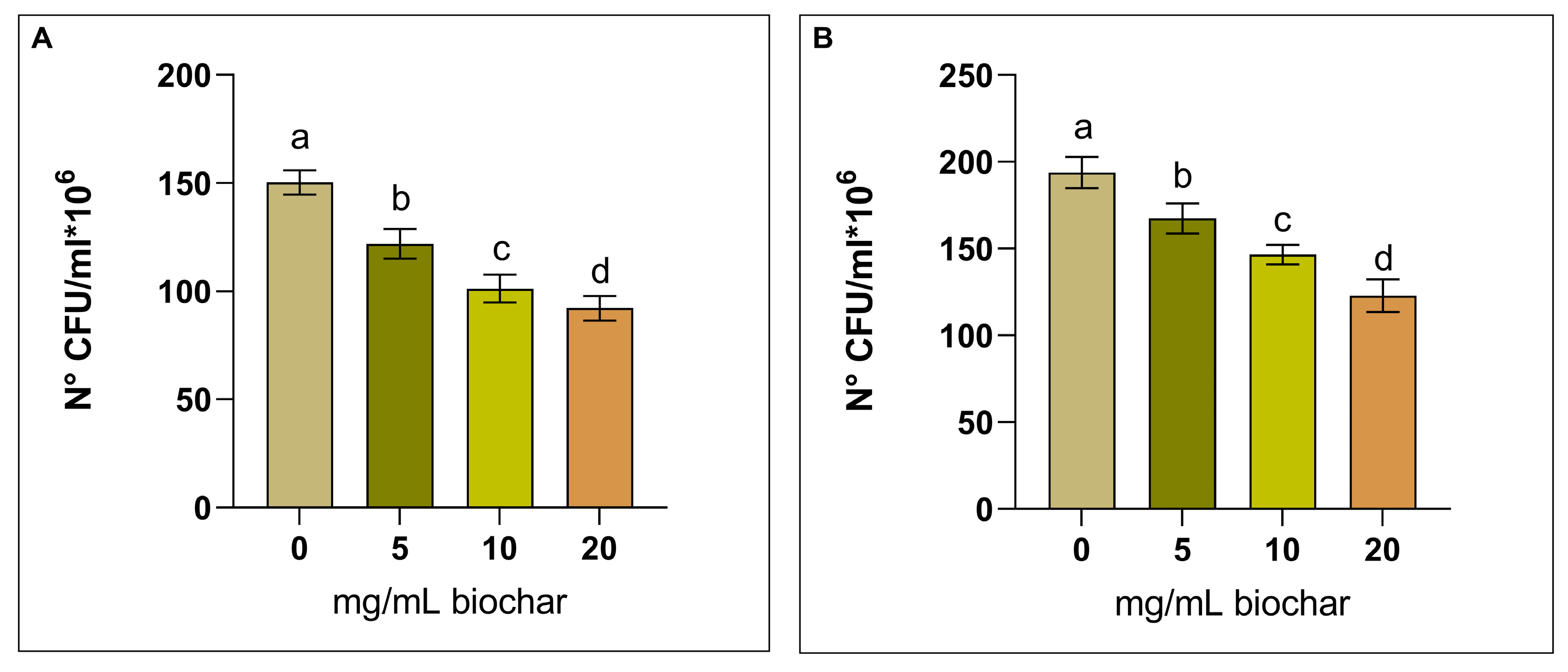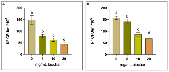 Adsorption of L. plantarum (A) and L. reuteri (B) with 0, 5, 10, and 20 mL/mL of VB biochar after two hours. The results are expressed as CFU/mL ± SD. Letters represent significant differences (p ≤ 0.05).