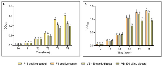 Growth inhibitory activity of biochar digesta against E. coli F18+ (A) and E. coli F4+ (B) at doses of 150 and 300 μL/mL for five hours of contact. Different letters indicate significant differences at p < 0.05 among different concentrations within the same timepoint.
