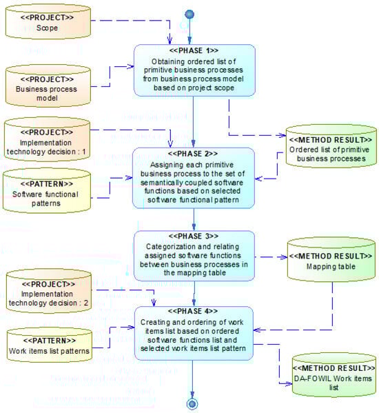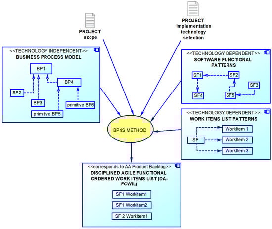 - The method BPriS (Disciplined Agile Delivery Planning Method Based on Work Items List Pattern Applied to Prioritized Semantically Coupled Software Functions Derived from Business Process Model and Software Functional Patterns)—for the creation of DA-FOWIL, based on business process model mapping to software functions, software development prioritization, semantic coupling of software functions, technology-dependent software functional patterns and work items list patterns.