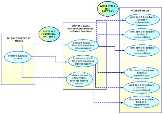 | Agile software development planning and automation | Software development process model, agile continuous planning [106], delivery and integration [107] Domain experts [116] and clients [117] to be included in the process Automation and DevOps practice [121,122] | Development planning based on business process model, software functional patterns and work items list patterns Table for mapping primitive business processes to prioritized sets of software functions Work items list patterns based on software architectures |