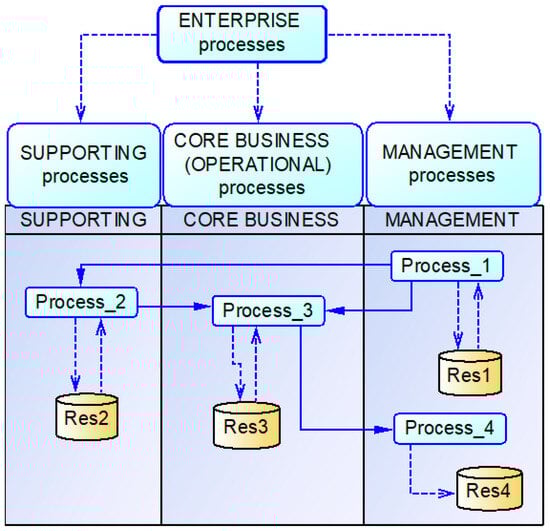 - Initial categorization of enterprise business processes could be performed at the global level, according to Rajarathinam et al. [32] as management process, operational process and the supportive process. Figure 6 presents an abstract business process model with categorization of business processes according to [32], with addition of having both “core business” term proposed in this manuscript as synonym to “operational” business processes. This way, categorization from [32] was enhanced and visualized at Figure 6.