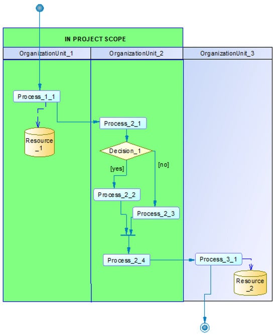 - Business processes segmentation, according to the project scope—some business process models are widely set to enable broader process context understanding. Usually, not all business processes will be automated, i.e., supported by software functions within the project scope. In such cases, there should be business processes segmentation conducted, where primitive business processes that are out of project scope should be eliminated from further processing in this method. (Figure 7).