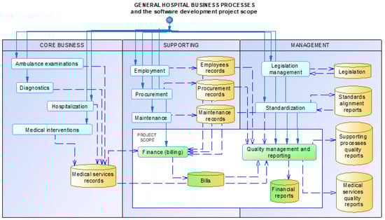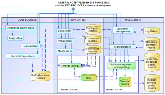 - Global business processes level—according to categorization from [32], this method proposes that first priority should have business processes as the core business scope, the second priority being supporting processes and the third priority being managerial processes. Therefore, software functions derived from these groups of business processes should be arranged with this ordering.