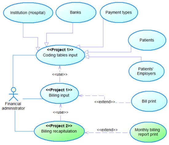 - Coding tables input functions for data regarding hospitals, banks, patients, payment types, patients’ employers). These data are needed for billing input and the billing input depends on them, as annotated with stereotype “use”.