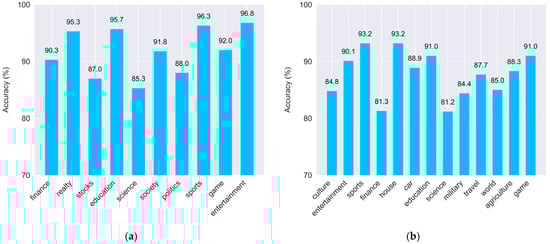 - TNews [44]: This dataset, collected from the Toutiao news app, was also filtered using the same length criterion. A total of 130,000 samples were selected, evenly covering 13 categories.