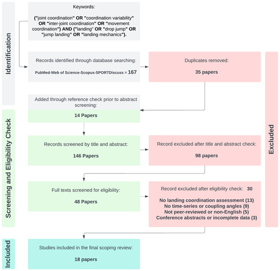 Search Strategy: The following search strategy was used in PubMed and adapted for other databases (i.e., Web of Science, Scopus, SPORTDiscus) using equivalent field tags: (“joint coordination” OR “coordination variability” OR “inter-joint coordination” OR “movement coordination”) AND (landing OR “drop jump” OR “jump landing” OR “landing mechanics”). No restrictions were placed on publication year, and results were limited to peer-reviewed journal articles published in English. The final search was conducted in March 2024.