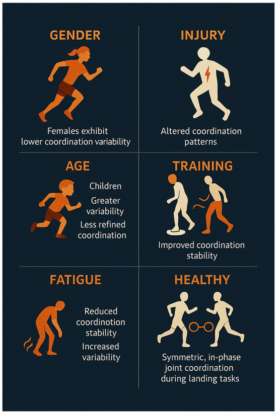 In closing this section, healthy individuals provide a reference model of coordinated landing: generally, in-phase, coordinated joint flexion to absorb impact, with some variability and adaptability to meet task demands. When tasks become more challenging (unexpected, multi-directional, repetitive, or unilateral), coordination can shift—often becoming less optimal (i.e., reduced synchronization or increased variability). These findings underscore why training in varied landing scenarios is beneficial: it can broaden an athlete’s repertoire of coordination strategies and potentially improve their ability to handle non-ideal situations (like an awkward land) without getting injured. They also highlight that even in healthy people, fatigue and complexity can transiently induce patterns reminiscent of at-risk profiles (i.e., the second landing’s increased variability). Thus, assessing coordination across different conditions is important in research and practical assessments (i.e., jump tests might include a fatigue element to reveal how coordination breaks down). Figure 2 portrays the effects of gender, injury, age, training, and fatigue on lower limb coordination and coordination variability during landing.