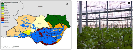 (A) Distribution of greenhouses (in blue) and classification of municipalities according to surface area in the region of Campo de Dalías in Almería [2]. (B) Details of greenhouse crop with polypropylene raffia placed vertically.