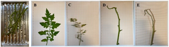 The moisture content of the agricultural residues was determined by drying the samples to constant weight in a drying oven, of the forced-draught type. In the first step, leaf and stem samples were distributed on metal trays and weighed. In addition, stem diameters were measured. Afterwards, the samples were placed in the drying oven, at a temperature of 70 ± 5 °C, until constant weighing (Figure 3A). The temperature was maintained within this range to avoid any potential damage to the plant structure arising from excessive heat. Figure 3B–E show the samples after oven-drying.