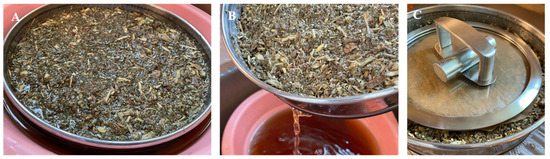 To ensure the effective removal of surface water, the fibres were extracted from the water, placed on a wet wallet and subjected to a pressure of 600 g for a duration of 30 s (Figure 4C), according to the procedure described by Cottrell et al. (2023) [35].