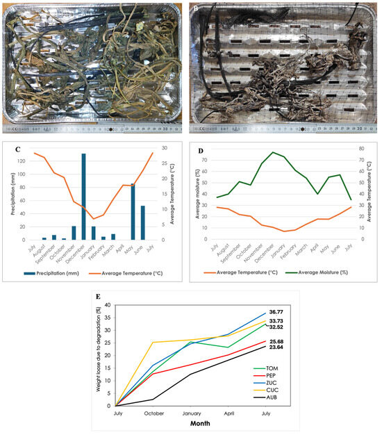(A) Preparation of the samples on the perforated metal tray before testing, (B) samples after 12 months on the exterior roof, (C) average temperature (°C) and precipitations (mm) (data from the meteorological station of Granada from July 2022 to July 2023 [36]), (D) average temperature (°C) and moisture (%) (data from the meteorological station of Granada from July 2022 to July 2023 [36]), and (E) results graph showing weight loss (%) due to environmental degradation effects as a function of time.