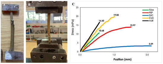 (A) Sample preparation for tensile strength test. (B) Aubergine stem tensile test. (C) Representative tensile strength–strain diagram.