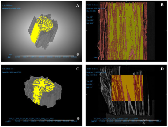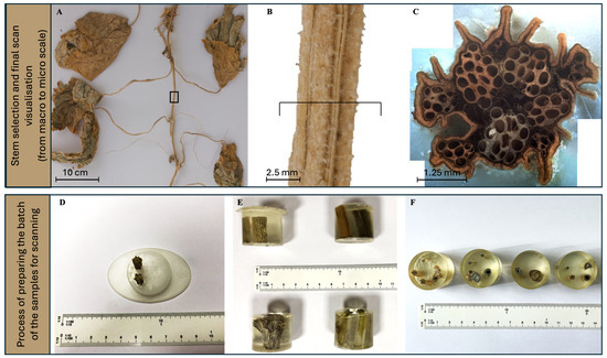 The sample preparation protocol was conducted in the designated biological sample preparation laboratory, with the objective of dehydrating the samples through a gradual increase in ethanol concentrations. The solutions employed in this process included 70% ethanol (70 mL of 100% ethanol + 30 mL of distilled water), 90% ethanol (90 mL of 100% ethanol + 10 mL of distilled water) and 100% ethanol (100 mL of 100% ethanol). The 100% ethanol solution was prepared with the addition of 1% iodine to ensure correct visualisation of the stems, in accordance with Donaldson and Frankland (2004) and Yaklich et al. (1999) [39,40]. Then, the samples were left to dry in the oven at 35 °C for 3 days, after which they were prepared for X-ray microscopy analysis (Figure 8A).