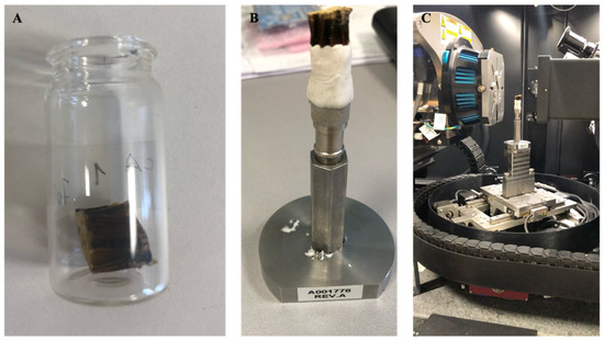 The sample was then affixed in the scanning holder (Figure 8B). For the analysis, a high-resolution 3D X-ray microscope (Xradia 510 VERSA ZEISS, manufactured by ZEISS in Oberkochen, Germany) and computed tomography scanner were employed to obtain advanced non-destructive three-dimensional imaging solutions formed with high-contrast and submicron-resolution images (700 nm). This method is applicable to samples such as stems that are relatively large (Figure 8C).