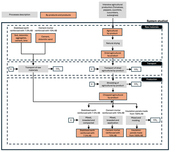 Description of the production process of the materials and system applied for the calculation of the LCA.