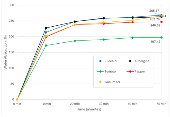 As illustrated in Figure 10, the samples exhibited a rapid absorption phase during the initial 20–30 min of soaking. This behaviour is comparable and consistent with other research on natural fibres [53]. The saturation point was generally reached between 40 and 50 min of soaking, except for cucumber fibres, which demonstrated an ongoing increase in absorption. The average water absorption values after 50 min of soaking demonstrated that the fibres belonging to the Cucurbitaceae plant family exhibited the highest absorption capacity, with zucchini and cucumber reaching mean values of 268.57 ± 2.03% and 266.31 ± 1.88%, respectively (Figure 10 and Table 4). Conversely, the fibres with the lowest mean absorption values were tomato and pepper. The percentage of water absorbed is similar to that of other natural fibres, such as banana, sisal, bagasse and jute fibres [35,54,55].