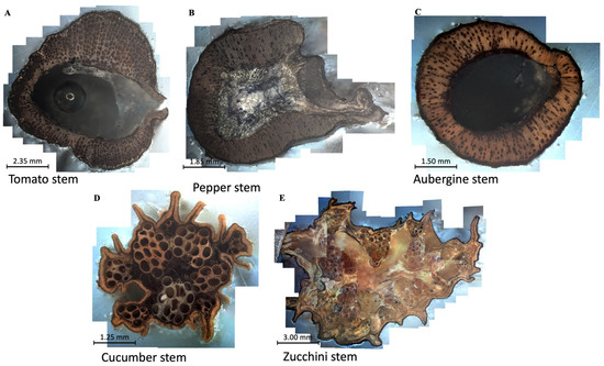 A detailed analysis of the microstructure of tomato, pepper, zucchini, cucumber and aubergine stems was conducted using a Nikon Epiphot 200 microscope (Japan) with an inverted plate and polarised light. The optical microscope was equipped with a 7 Mp digital camera connected to a computer, and the software used was Clear Vision’s Perfect Image (NIS BR 4.60x version), which enabled the transformation of the digitised image from pixels to micrometres. The lens used in this study offered a magnification of 5×.