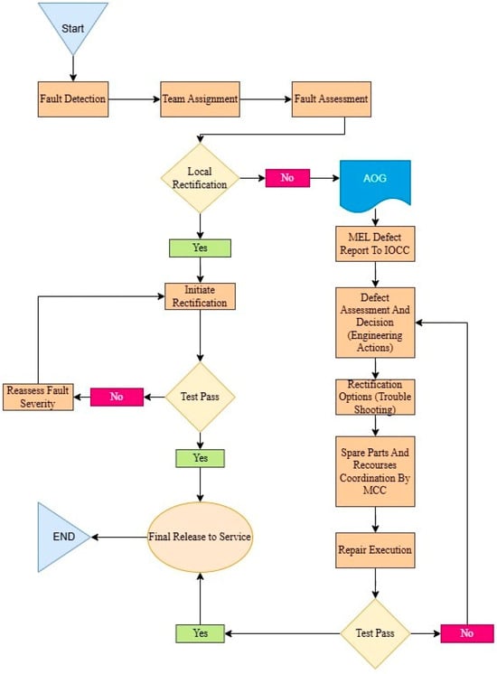 The fault rectification flowchart (Figure 1), designed for maintenance failures, is an overview of the course of action relating to an aircraft with technical problems. The first part of the chart illustrates the situation when an issue occurs and good-conditioned spare parts are available. Local rectification follows for a particular scenario. The second part of the flowchart describes the step-by-step actions that shall be taken to return the aircraft to service in case of AOG. The initial phase involves identifying that the fault cannot be rectified locally. At this stage, the problem is confirmed in the MEL Defect category, which involves the Integrated Operations Control Centre (IOCC) receiving the immediate report. The IOCC controls and secures high-impact aircraft operations and regulatory compliance. The primary aim of the IOCC is event response coordination, which involves the team making up the immediate report, as well as urgently deciding which operating aircraft should be alive and ensuring compliance with the established safety standards. The next step includes the Analysis of Deviation along with the decision-making capability. This stage entailed the engineering teams performing inspections and tests to identify the fault, utilizing diagnostic tools and historical data. This step is a significant factor that detects the root cause of the problem and the goals, thereby defining the solution with the help of safety and regulatory authorities.