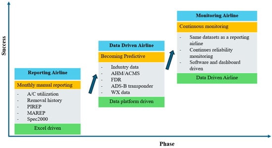 Research by EXSYN [9] identifies three key stages for airlines to transition into predictive, data-driven organizations (Figure 3) where airlines adopting predictive maintenance move through three stages: reporting, monitoring, and data-driven. PdM and AHM systems are no longer luxuries but necessities, providing critical support for maintenance and operational efficiency. The challenge lies in balancing OEM strategies with airline needs to ensure seamless data-sharing and stakeholder collaboration.