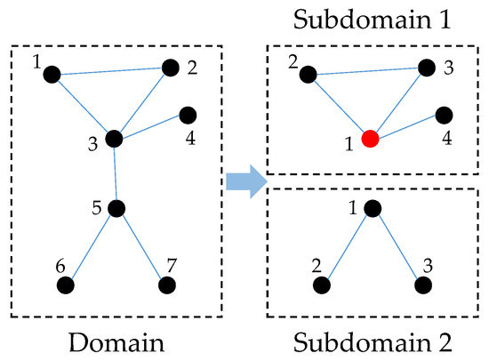 In this study, the graph partitioning algorithm METIS [53] was utilized. METIS is a well-known algorithm that divides graph nodes into cohesive clusters to effectively minimize edge cuts (defined as the number of edges connecting different clusters). The overall graph partitioning phase consists of three stages—coarsening, division, and refinement. In the reordering phase, the graph is partitioned using a multilevel full set of dissection strategies, and the number of partitions divided depends on the actual situation. Taking a graph divided into two subdomains as an example, as shown in Figure 3. The original graph region contains seven nodes, and the nodes are connected with edges. When the graph is divided and rearranged, each node has a different sequence number, the node with the most connected edges (the red node in Figure 3) is usually selected for division. When the graph is divided into two different subdomains, the nodes within the same subdomain are sequentially renumbered to create a reordered mapping to minimize the filling of sparse matrices [55]. As shown in Figure 4, graph reordering can be categorized as full graph reordering or partition reordering. Figure 4b represents full graph rearrangement, i.e., the rearrangement of elements in the entire graph. Full graph rearrangement results in a tightly arranged block of non-zero elements, and although it also centralizes the non-zero elements, having only one block of elements is not conducive to parallel computation. Figure 4c represents partitioned rearrangement, where the graph is first partitioned and then subdivided so that tightly arranged blocks of elements can be obtained in different partitions; this is favorable for parallel computation. Through graph partitioning and reordering, a reordered matrix with multiple partitions is obtained, where non-zero elements are tightly arranged. This arrangement facilitates the subsequent iterative solving process. In the pre-factorization and solving stage, the challenge of parallelism due to forward/backward substitution during the ILU factorization process is effectively mitigated by assigning matrix blocks from different partitions to different processor cores for factorization and solving computations. To address communication issues between different partitions, boundary node communication can be employed. Specifically, each partition’s boundary nodes interact with neighboring partitions through transfer interfaces such as MPI, ensuring efficient data exchange and synchronization.