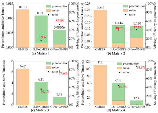 In the four matrix-solving tests, the efficiency of G-Pre solving improved by 53.5%, 42.1%, 77.6%, and 88.8%, respectively, compared to solving directly with GMRES, and improved by 44.9%, 2.8%, 64.8%, and 79.9%, respectively, compared to solving with ILU factorization. Comparing G-Pre preconditioning and ILU factorization, G-Pre preconditioning exhibited greater speedup, more than doubling the performance for matrices 3 and 4, indicating higher solution efficiency in G-Pre.