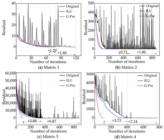 The condition numbers of the matrix A in its initial state were compared with those after preconditioning using ILU and G-Pre, respectively. The results are shown in Table 2. In the initial case, the condition numbers of the different matrices were very large, leading to instability during numerical computation. However, after preconditioning, the condition numbers of the matrices were reduced to some extent. Specifically, the G-Pre preconditioning algorithm significantly outperformed ILU factorization in optimizing the condition numbers. For several matrices in this test, the G-Pre preconditioning algorithm improved the condition number by an average factor of 2.6 compared to that of ILU factorization. Lower condition numbers also imply higher stability in the solving iteration process for G-Pre, as will be demonstrated in the convergence performance comparison during the matrix solving process.