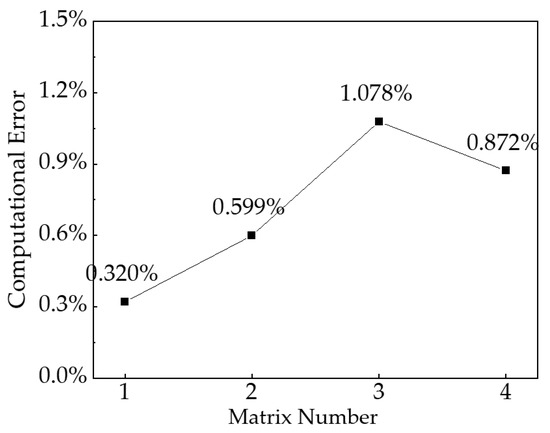 Both the result accuracy and solution efficiency are crucial metrics in matrix solving. The accuracy of the results determines whether the final simulation outcomes can accurately reflect real-world situations. It is essential for a solver to produce accurate results while maintaining high solution efficiency, which is vital for the comprehensive evaluation of the solution process. To further investigate whether the G-Pre solving process affects the matrix results, this section compares its solving results with the original results. The error analysis, which is presented in Figure 8, shows that the errors in the results obtained from G-Pre remained at around 1%. This indicates that using G-Pre has minimal impact on the matrix results, thereby validating the feasibility and effectiveness of the G-Pre algorithm. The low error rate demonstrates that G-Pre not only achieved a high solution efficiency but also maintained a high level of accuracy. These findings reinforce the suitability of G-Pre for practical applications where both precision and performance are critical. However, it is also easy to see from Figure 8 that the error rate of the results of the small-scale Matrix 3 was higher than that of the large-scale Matrix 4. This is contrary to the difference in dimensions between Matrix 3 and Matrix 4. To analyze why the difference occurred, it can be compared with the iterative convergence process of the matrices in Figure 7. As can be seen in Figure 7, the residuals at the beginning of the iteration for Matrix 3 were much larger than the initial residuals for Matrix 4. This was due to the difference between the initial solution determined at the beginning stage of the iterative method and the actual solution, whereby the initial solution assumed for Matrix 3 had a larger error from the actual solution. This also affected the greater error in the approximate solution that was eventually obtained, resulting in a different value of the residuals of the two matrices from the convergence bounds when the convergence bounds were reached, which, in turn, made the error in the results of Matrix 3 greater.
